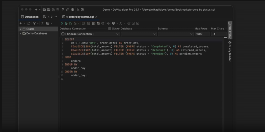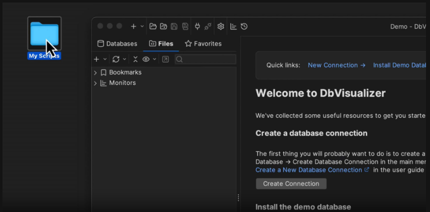 SQLスクリプトの管理がこれまで以上に便利になりました。ブックマークに加え、アプリケーション内で簡単にアクセスできるように、任意の外部スクリプトディレクトリを追加できるようになりました。作業スタイルに合わせてカスタムパスを追加したり、共有スクリプトディレクトリやネットワークロケーションをマウントして、チームメンバーとの共有を容易にすることができます。マウントされたディレクトリでの外部変更はDbVisualizerによって自動的に検出され、非同期I/Oにより、遅いファイルシステムによって作業がブロックされることはありません。