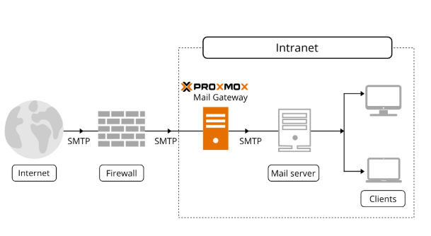 Proxmox Mail Gatewayをファイアウォールとメールサーバーの間に配置することで、すべてのメールトラフィック(SMTP)はまずMail Gatewayに転送され、不要なメールはフィルタリングされ、削除または拒否されます(キュー前のフィルタリング)。その後、メールはメールサーバーに転送されます。